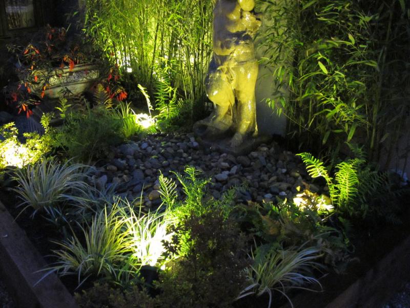 For instance the ground may have an interesting texture, like some stunning patio slates or well pruned grass, well to entice people to look at this section some low level cross light can draw attention below eye level. Trees and other features which stand higher up can also be pointed out, in turn the atmosphere will become low-key.