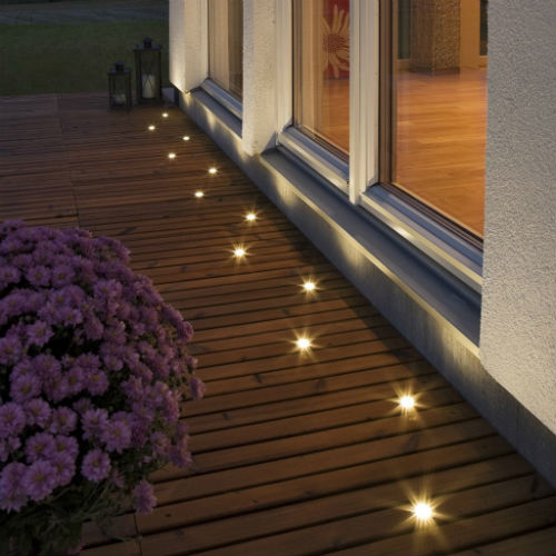 Deck lighting fittings are similar to in-ground light fittings. The difference is that they are shorter as they will be fitted into wood rather than the ground. They can, however, also be used as ground lights if conditions allow, for example in small flowerbeds or rockeries.